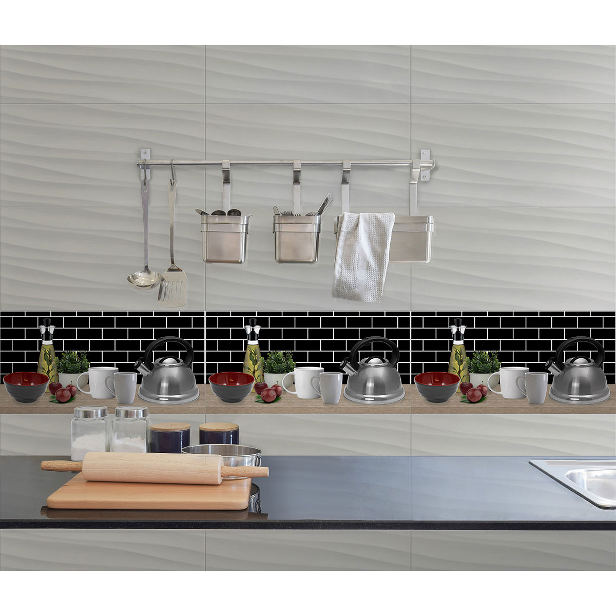 Acabado Brillante en color Multicolor y formato 30X60. Su diseño recrea una cocina moderna, de alto brillo, decorada con bricks negros en contraste con la boquilla blanca y su mesón en madera natural resalta los objetos cerámicos en tonos blancos y rojo intenso, y una tetera de aluminio brillante.