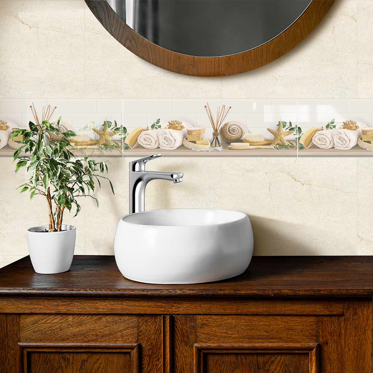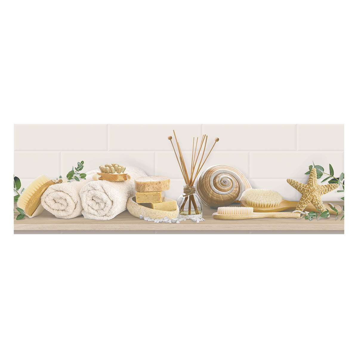 Diseño inspirado en un espacio de spa y sus elementos relajantes con diseño moderno que simula un fondo de bricks con elementos que normalmente encontraríamos en un spa, en tonalidades cálidas combinadas con el verde. Su acabado es brillante enriquecido con granilla transparente que le aporta mayor brillo.