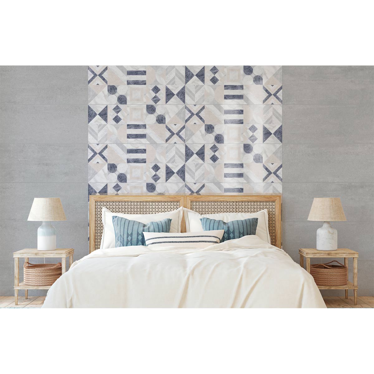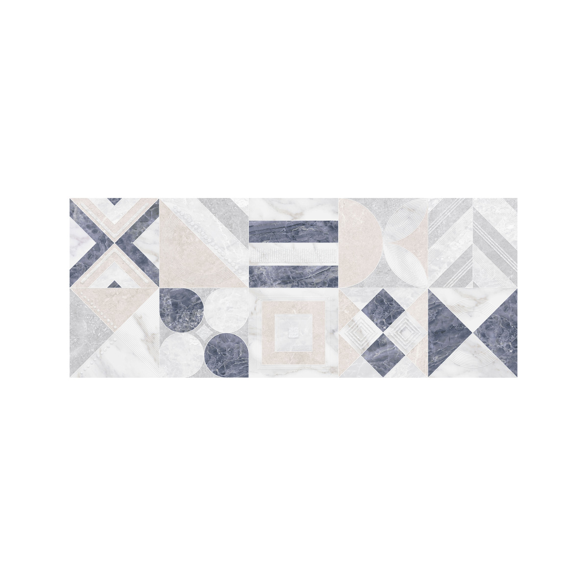Acabado brillante en tonalidades neutras y toques azules. Inspirada en azulejos de 15×15, con geometrías simples y modernas que se fusionan con gráficas marmolizadas de alto realismo.