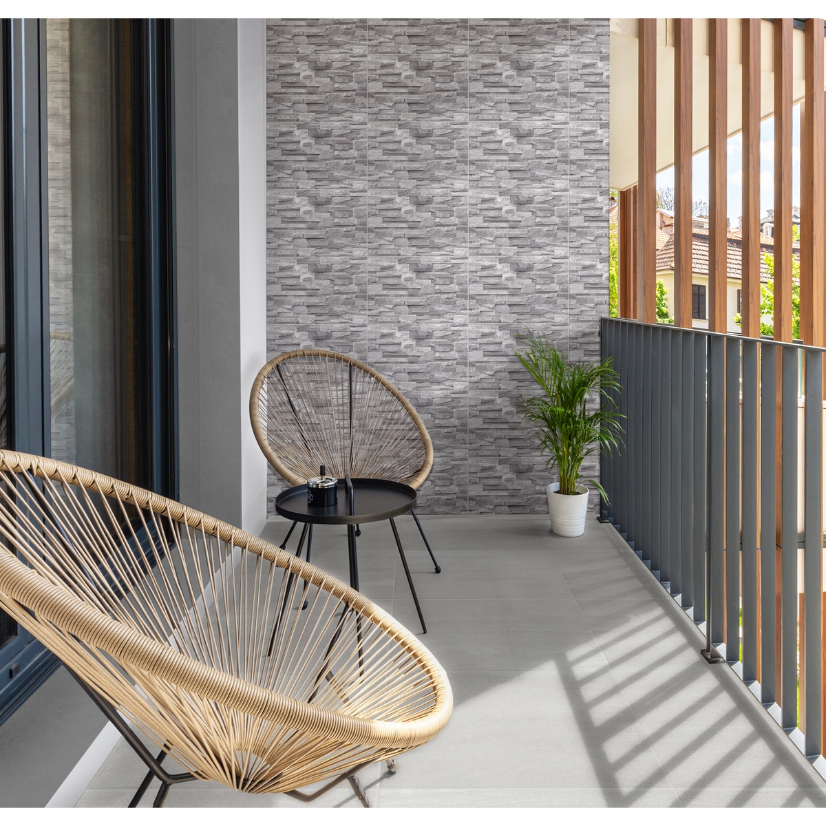 La pared Corona, tipo fachaleta Santa María gris con acabado brillante, formato 30×45 y con una única cara. Su diseño de alto realismo y definición simula una fachaleta estructurada en una pieza plana (producto NO estructurado).