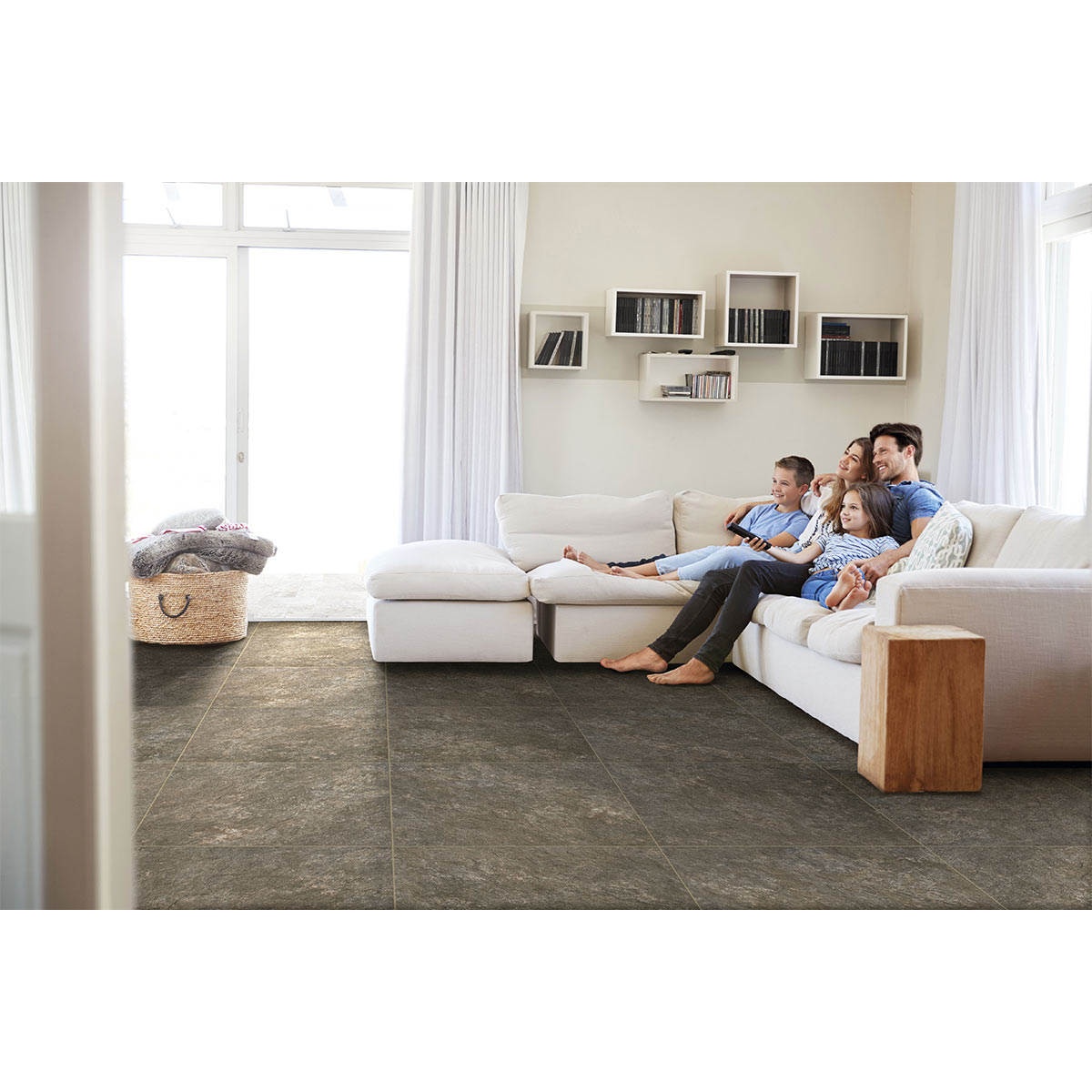 Piso natural estructurado mate FENICIA color óxido de formato 60×60, con diseño de piedra tipo pizarra en color óxido con una gráfica de veta enriquecida, una estructura que simula la piedra y un acabado de puntos metálicos brillantes que le dan un efecto más realista, con cuatro caras diferenciadas, alto grado de naturalidad, mayor resistencia…